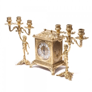 Витончені камінний годинник з бронзи і два канделябра Bambino - втілення розкоші і елегантності. Хронометр класичної прямокутної форми прикрашений дивовижними візерунками і різьбленням. Комплект якнайкраще доповнюють два підсвічники, виконані у вигляді фігурок маленьких хлопчиків, які тримають підставки під свічки, немов смолоскипи. Композиція пофарбована в благородний відтінок золота, вигідно підкреслює кожен вигин і деталь.