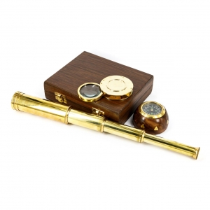 Морський телескоп, пісочний годинник, і компас "під старовину" - комплект колекційних сувенірів і відмінний декор з предметів в морському стилі. Набір морських латунних інструментів в дерев'яній коробці - чудовий подарунок будь-якому досліднику або мандрівникові. Компас з латуні вставлений в дерев'яний корпус з красивою структурою. Подарункова дерев'яна коробка оснащена двома золотистими засувками для зручного зберігання. Внутрішня поверхня футляра викладена м'якою бархатистою тканиною. Латунні інструменти в історичному дизайні роблять цей набір унікальним інтер'єрним прикрасою. Підзорні труби купити можна як інтригуючий акцент будь-якого офісу, бібліотеки або вдома, який обов'язково викличе думки про мирських пригоди!