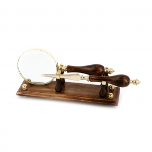 Гарний подарунковий набір складається з збільшувального скла на підставці і ножа для конвертів. Чудовий комплект проводиться під брендом Albero Ode, які займаються виготовленням офісних аксесуарів з натурального дерева. Дизайн розробляється італійськими модельєрами. Поєднання структурної деревини та золотистого кольору латунного сплаву створює шикарний візуальний ефект.